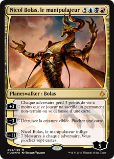 | Rules | +3: Each opponent loses 3 life unless that player sacrifices a nonland permanent or discards a card. −3: Destroy target creature. Draw a card. −11: Nicol Bolas, the Deceiver deals 7 damage to each opponent. You draw seven cards. |