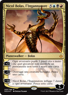 | Rules | +3: Each opponent loses 3 life unless that player sacrifices a nonland permanent or discards a card. −3: Destroy target creature. Draw a card. −11: Nicol Bolas, the Deceiver deals 7 damage to each opponent. You draw seven cards. |