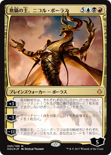 | Rules | +3: Each opponent loses 3 life unless that player sacrifices a nonland permanent or discards a card. −3: Destroy target creature. Draw a card. −11: Nicol Bolas, the Deceiver deals 7 damage to each opponent. You draw seven cards. |