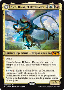 | Rules | Flying When Nicol Bolas, the Ravager enters the battlefield, each opponent discards a card. : Exile Nicol Bolas, the Ravager, then return him to the battlefield transformed under his owner's control. Activate only as a sorcery. // +2: Draw two cards. −3: Nicol Bolas, the Arisen deals 10 damage to target creature or planeswalker. −4: Put target creature or planeswalker card from a graveyard onto the battlefield under your control. −12: Exile all but the bottom card of target player's library. |