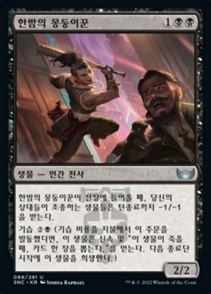 | Rules | When Night Clubber enters the battlefield, creatures your opponents control get -1/-1 until end of turn. Blitz (If you cast this spell for its blitz cost, it gains haste and "When this creature dies, draw a card." Sacrifice it at the beginning of the next end step.) |