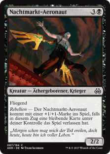 | Rules | Flying Revolt — Night Market Aeronaut enters the battlefield with a +1/+1 counter on it if a permanent you controlled left the battlefield this turn. |