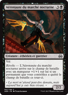 | Rules | Flying Revolt — Night Market Aeronaut enters the battlefield with a +1/+1 counter on it if a permanent you controlled left the battlefield this turn. |