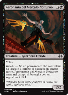| Rules | Flying Revolt — Night Market Aeronaut enters the battlefield with a +1/+1 counter on it if a permanent you controlled left the battlefield this turn. |