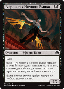| Rules | Flying Revolt — Night Market Aeronaut enters the battlefield with a +1/+1 counter on it if a permanent you controlled left the battlefield this turn. |