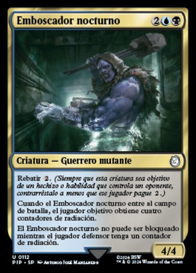 | Rules | Ward (Whenever this creature becomes the target of a spell or ability an opponent controls, counter it unless that player pays .) When Nightkin Ambusher enters the battlefield, target player gets four rad counters. Nightkin Ambusher can't be blocked as long as defending player has a rad counter. |