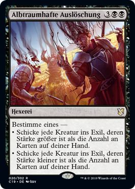 | Rules | Choose one — • Exile each creature with power greater than the number of cards in your hand. • Exile each creature with power less than the number of cards in your hand. |