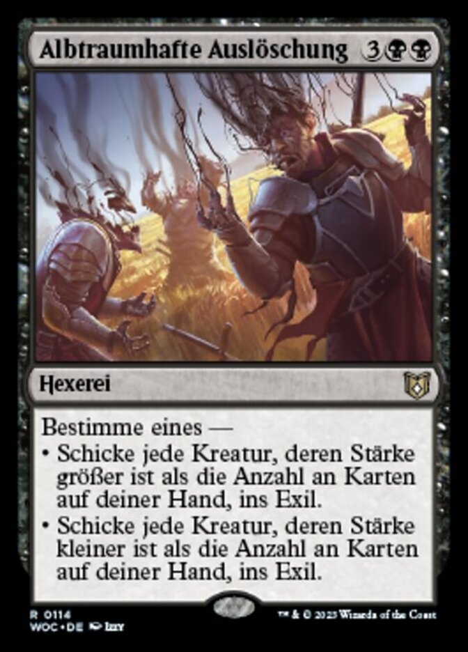 | Rules | Choose one — • Exile each creature with power greater than the number of cards in your hand. • Exile each creature with power less than the number of cards in your hand. |