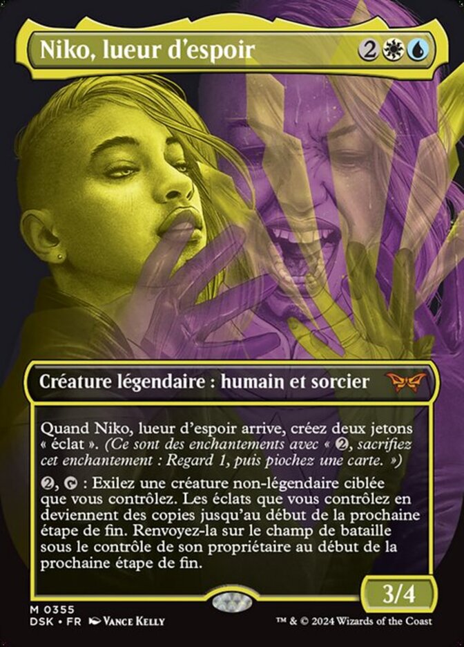 | Rules | When Niko, Light of Hope enters, create two Shard tokens. (They're enchantments with ", Sacrifice this enchantment: Scry 1, then draw a card.") , : Exile target nonlegendary creature you control. Shards you control become copies of it until the beginning of the next end step. Return it to the battlefield under its owner's control at the beginning of the next end step. |