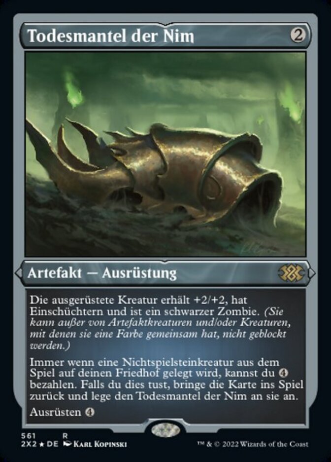| Rules | Equipped creature gets +2/+2, has intimidate, and is a black Zombie. (A creature with intimidate can't be blocked except by artifact creatures and/or creatures that share a color with it.) Whenever a nontoken creature is put into your graveyard from the battlefield, you may pay . If you do, return that card to the battlefield and attach Nim Deathmantle to it. Equip |