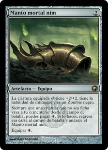 | Rules | Equipped creature gets +2/+2, has intimidate, and is a black Zombie. (A creature with intimidate can't be blocked except by artifact creatures and/or creatures that share a color with it.) Whenever a nontoken creature is put into your graveyard from the battlefield, you may pay . If you do, return that card to the battlefield and attach Nim Deathmantle to it. Equip |