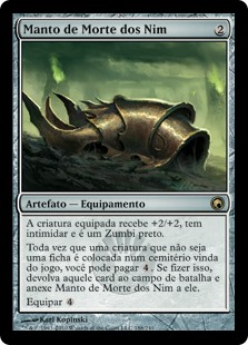 Whenever a nontoken creature is put into your graveyard from the battlefield, you may pay . If you do, return that card to the battlefield and attach Nim Deathmantle to it.