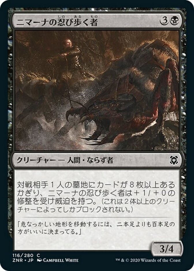 | Rules | As long as an opponent has eight or more cards in their graveyard, Nimana Skitter-Sneak gets +1/+0 and has menace. (It can't be blocked except by two or more creatures.) |
