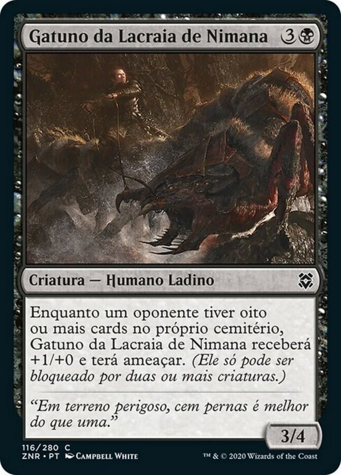 | Rules | As long as an opponent has eight or more cards in their graveyard, Nimana Skitter-Sneak gets +1/+0 and has menace. (It can't be blocked except by two or more creatures.) |
