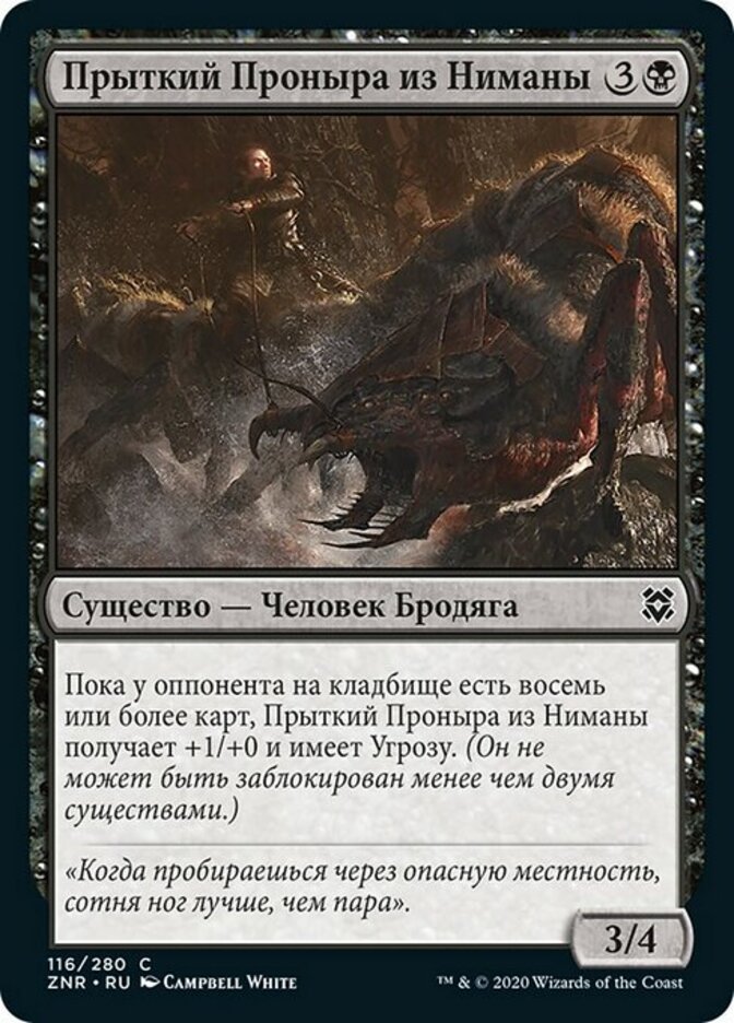 | Rules | As long as an opponent has eight or more cards in their graveyard, Nimana Skitter-Sneak gets +1/+0 and has menace. (It can't be blocked except by two or more creatures.) |