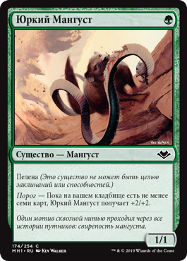 | Rules | Shroud (This creature can't be the target of spells or abilities.) Threshold — Nimble Mongoose gets +2/+2 as long as seven or more cards are in your graveyard. |