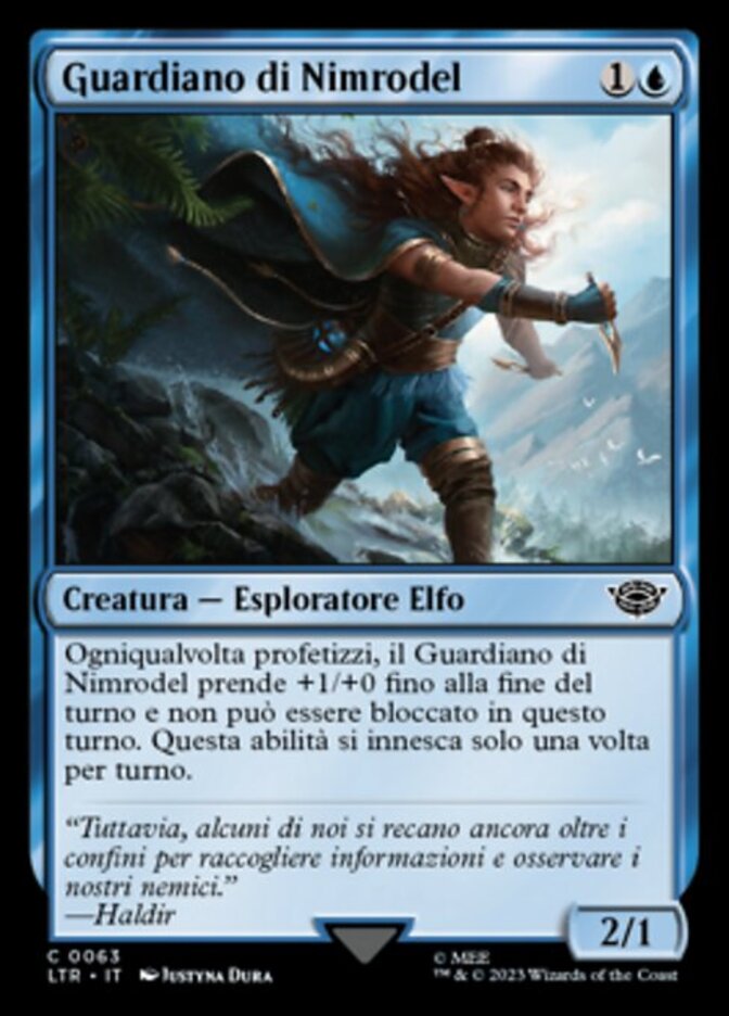 | Rules | Whenever you scry, Nimrodel Watcher gets +1/+0 until end of turn and can't be blocked this turn. This ability triggers only once each turn. |
