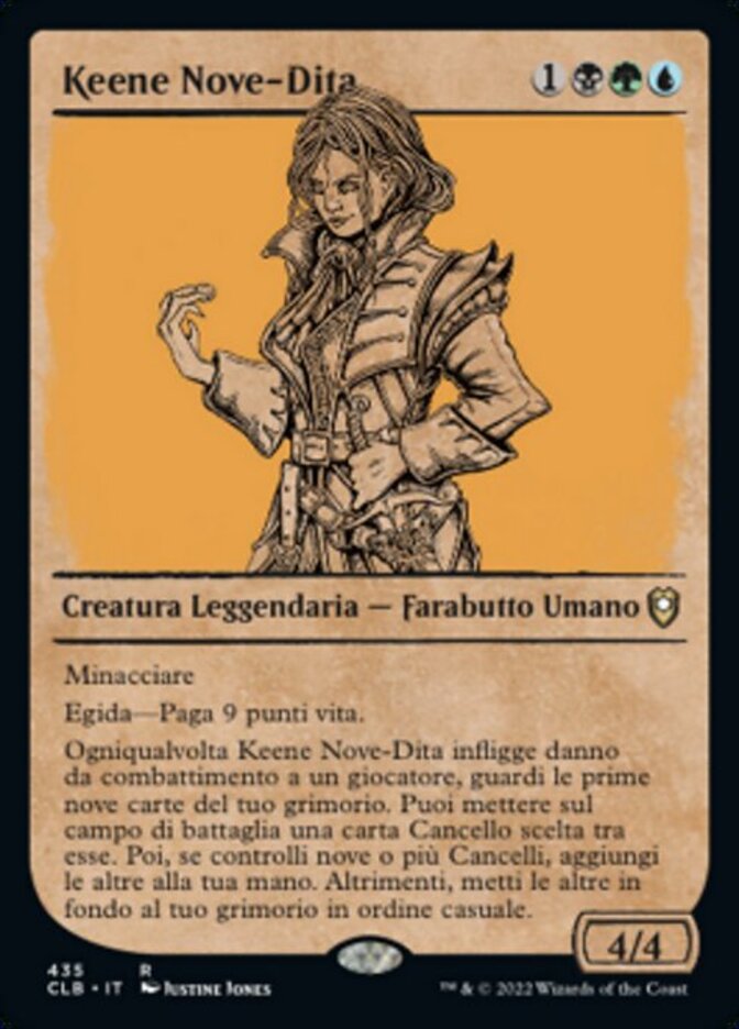 | Rules | Menace Ward—Pay 9 life. Whenever Nine-Fingers Keene deals combat damage to a player, look at the top nine cards of your library. You may put a Gate card from among them onto the battlefield. Then if you control nine or more Gates, put the rest into your hand. Otherwise, put the rest on the bottom of your library in a random order. |