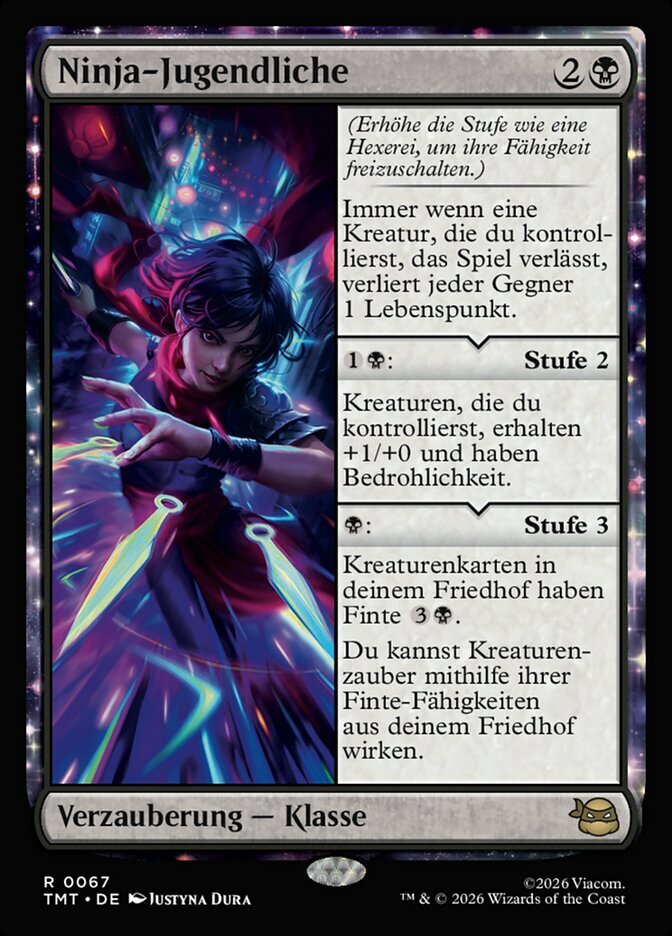 | Rules | (Gain the next level as a sorcery to add its ability.) Whenever a creature you control leaves the battlefield, each opponent loses 1 life. : Level 2 Creatures you control get +1/+0 and have menace. : Level 3 Creature cards in your graveyard have sneak . You may cast creature spells from your graveyard using their sneak abilities. |