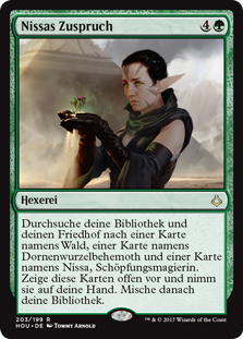 | Rules | Search your library and graveyard for a card named Forest, a card named Brambleweft Behemoth, and a card named Nissa, Genesis Mage. Reveal those cards, put them into your hand, then shuffle. |