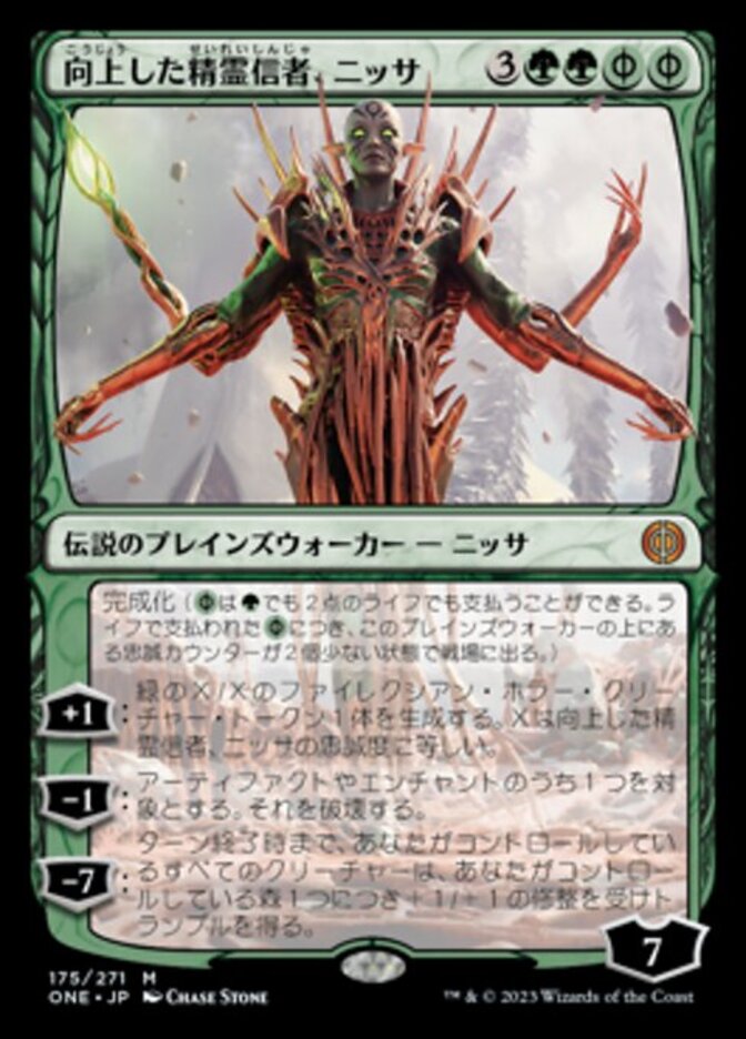 | Rules | Compleated ( can be paid with or 2 life. For each paid with life, this planeswalker enters with two fewer loyalty counters.) +1: Create an X/X green Phyrexian Horror creature token, where X is Nissa, Ascended Animist's loyalty. −1: Destroy target artifact or enchantment. −7: Until end of turn, creatures you control get +1/+1 for each Forest you control and gain trample. |