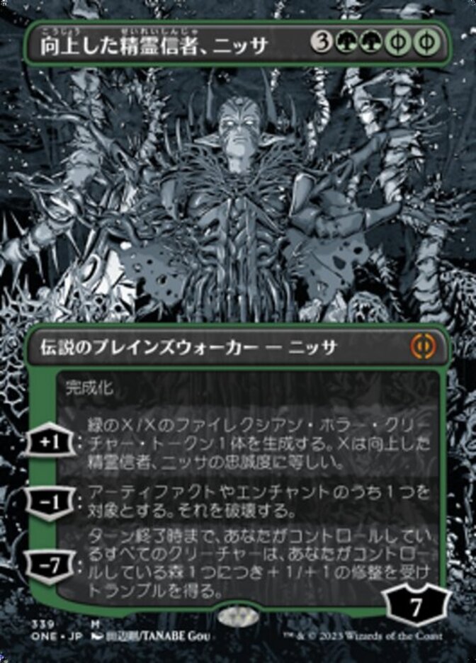 | Rules | Compleated ( can be paid with or 2 life. For each paid with life, this planeswalker enters with two fewer loyalty counters.) +1: Create an X/X green Phyrexian Horror creature token, where X is Nissa, Ascended Animist's loyalty. −1: Destroy target artifact or enchantment. −7: Until end of turn, creatures you control get +1/+1 for each Forest you control and gain trample. |