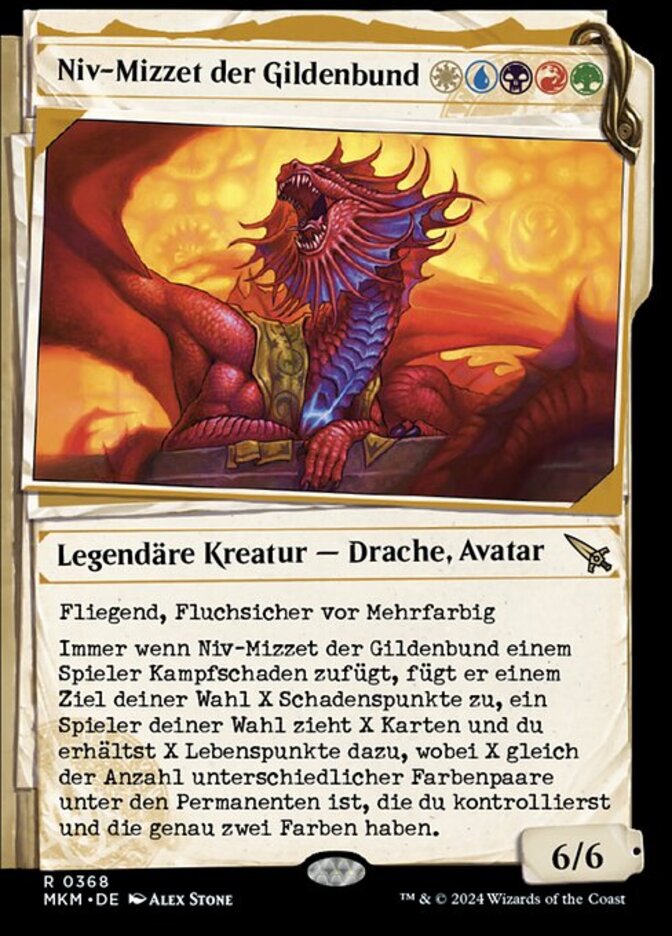| Rules | Flying, hexproof from multicolored Whenever Niv-Mizzet, Guildpact deals combat damage to a player, it deals X damage to any target, target player draws X cards, and you gain X life, where X is the number of different color pairs among permanents you control that are exactly two colors. |