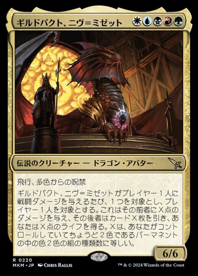 | Rules | Flying, hexproof from multicolored Whenever Niv-Mizzet, Guildpact deals combat damage to a player, it deals X damage to any target, target player draws X cards, and you gain X life, where X is the number of different color pairs among permanents you control that are exactly two colors. |