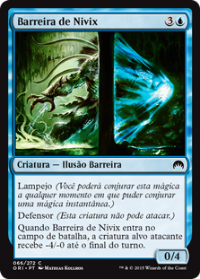 | Rules | Flash (You may cast this spell any time you could cast an instant.) Defender (This creature can't attack.) When Nivix Barrier enters the battlefield, target attacking creature gets -4/-0 until end of turn. |