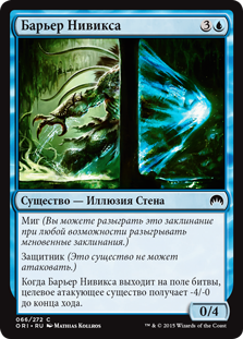 | Rules | Flash (You may cast this spell any time you could cast an instant.) Defender (This creature can't attack.) When Nivix Barrier enters the battlefield, target attacking creature gets -4/-0 until end of turn. |