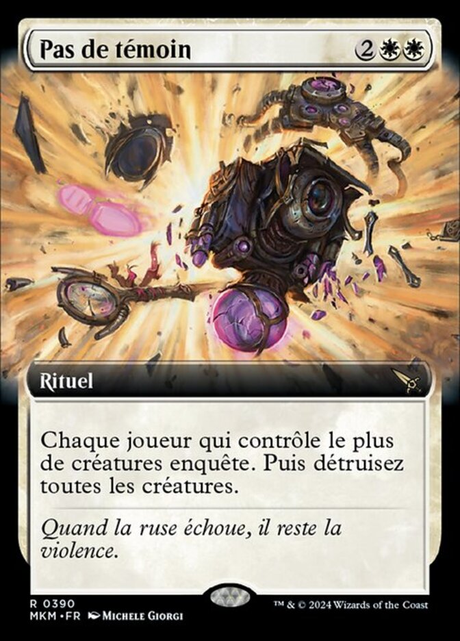 | Rules | Each player who controls the most creatures investigates. Then destroy all creatures. (To investigate, create a Clue token. It's an artifact with ", Sacrifice this artifact: Draw a card.") |