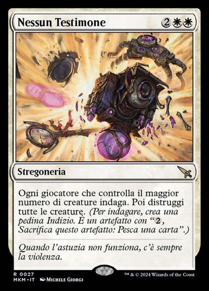 | Rules | Each player who controls the most creatures investigates. Then destroy all creatures. (To investigate, create a Clue token. It's an artifact with ", Sacrifice this artifact: Draw a card.") |