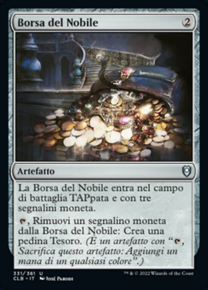 | Rules | Noble's Purse enters the battlefield tapped and with three coin counters on it. , Remove a coin counter from Noble's Purse: Create a Treasure token. (It's an artifact with ", Sacrifice this artifact: Add one mana of any color.") |