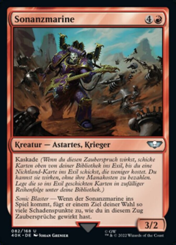 | Rules | Cascade (When you cast this spell, exile cards from the top of your library until you exile a nonland card that costs less. You may cast it without paying its mana cost. Put the exiled cards on the bottom of your library in a random order.) Sonic Blaster — When Noise Marine enters the battlefield, it deals damage equal to the number of spells you've cast this turn to any target. |