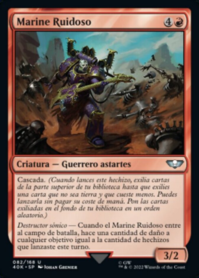 | Rules | Cascade (When you cast this spell, exile cards from the top of your library until you exile a nonland card that costs less. You may cast it without paying its mana cost. Put the exiled cards on the bottom of your library in a random order.) Sonic Blaster — When Noise Marine enters the battlefield, it deals damage equal to the number of spells you've cast this turn to any target. |