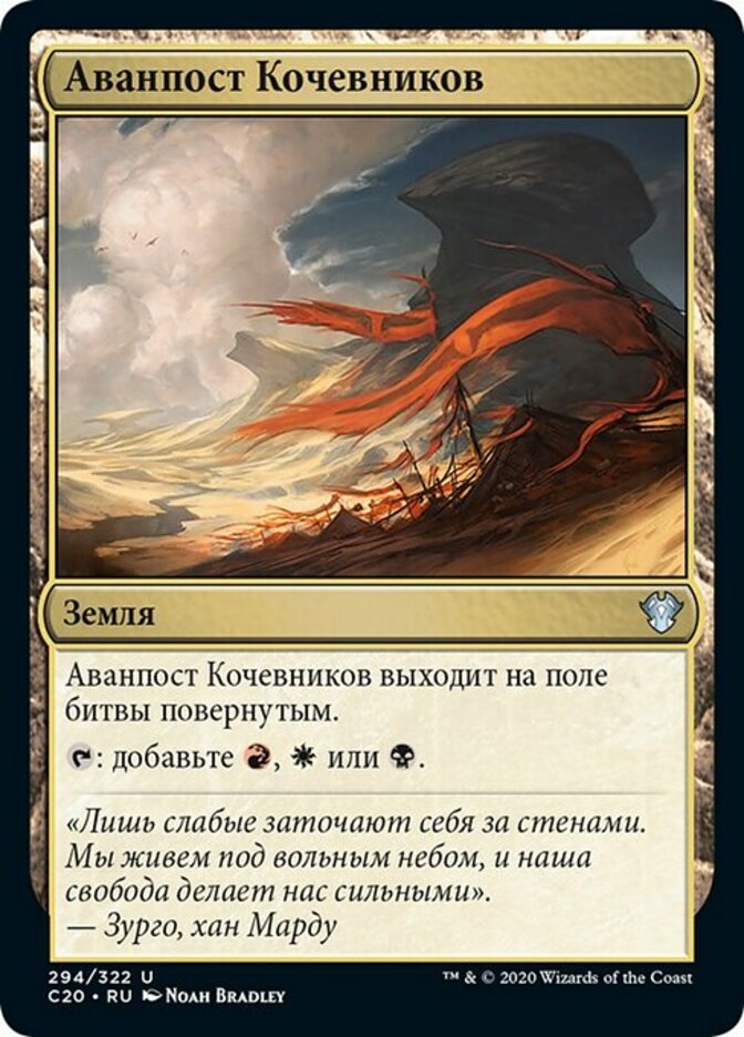 | Rules | Nomad Outpost enters the battlefield tapped. : Add , , or . |
