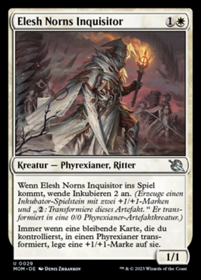 | Rules | When Norn's Inquisitor enters the battlefield, incubate 2. (Create an Incubator token with two +1/+1 counters on it and ": Transform this artifact." It transforms into a 0/0 Phyrexian artifact creature.) Whenever a permanent you control transforms into a Phyrexian, put a +1/+1 counter on it. |