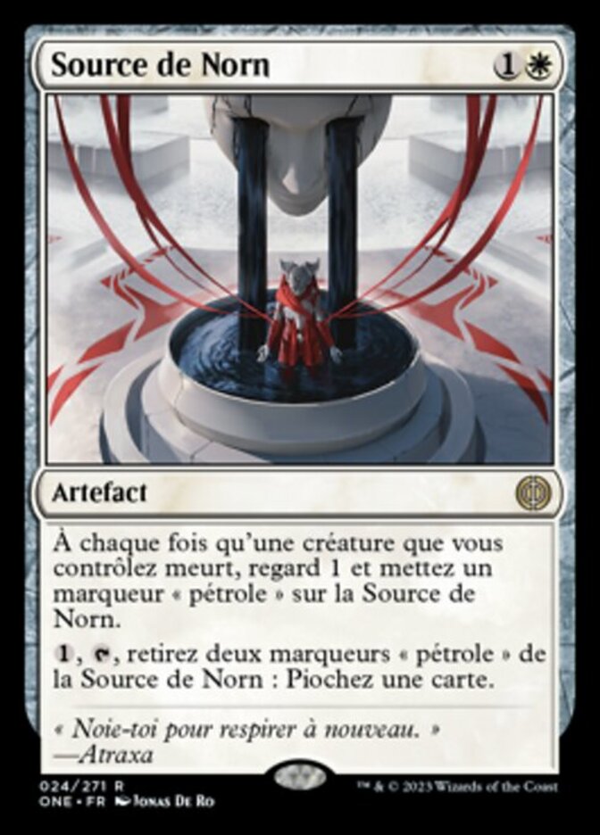 | Rules | Whenever a creature you control dies, scry 1 and put an oil counter on Norn's Wellspring. , , Remove two oil counters from Norn's Wellspring: Draw a card. |