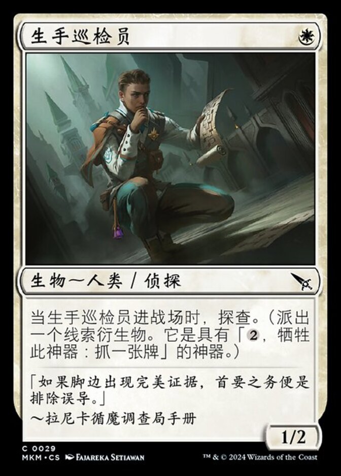 | Rules | When Novice Inspector enters the battlefield, investigate. (Create a Clue token. It's an artifact with ", Sacrifice this artifact: Draw a card.") |