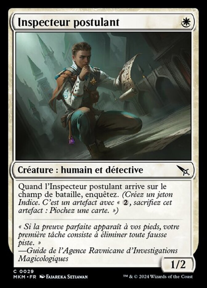 | Rules | When Novice Inspector enters the battlefield, investigate. (Create a Clue token. It's an artifact with ", Sacrifice this artifact: Draw a card.") |
