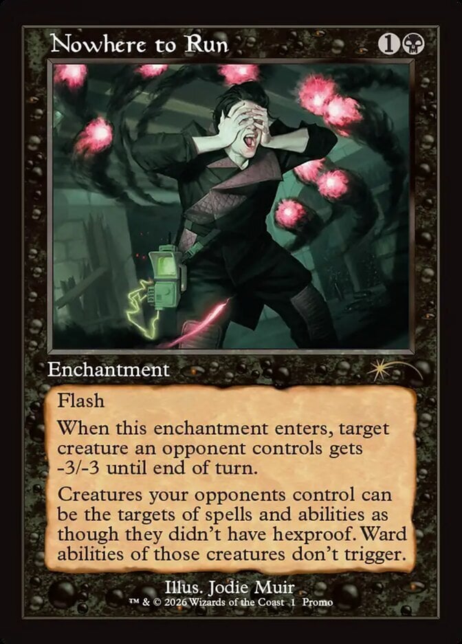 | Rules | Flash When Nowhere to Run enters, target creature an opponent controls gets -3/-3 until end of turn. Creatures your opponents control can be the targets of spells and abilities as though they didn't have hexproof. Ward abilities of those creatures don't trigger. |