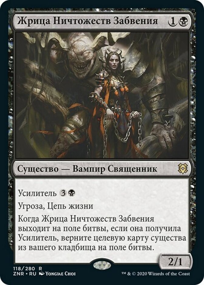 | Rules | Kicker Menace, lifelink When Nullpriest of Oblivion enters the battlefield, if it was kicked, return target creature card from your graveyard to the battlefield. |