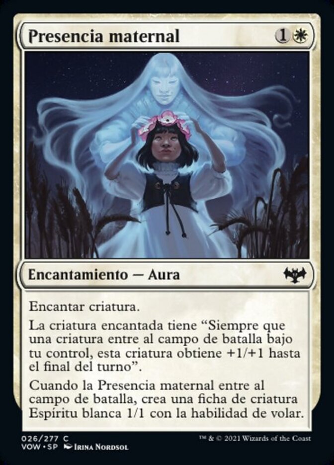 | Rules | Enchant creature Enchanted creature has "Whenever a creature enters the battlefield under your control, this creature gets +1/+1 until end of turn." When Nurturing Presence enters the battlefield, create a 1/1 white Spirit creature token with flying. |