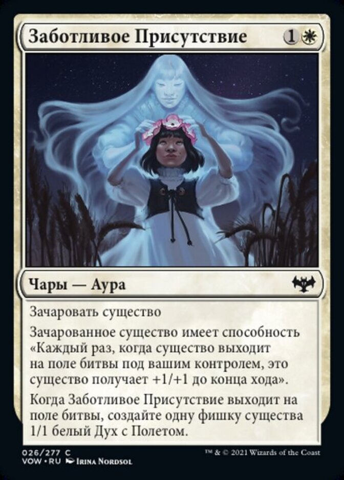 | Rules | Enchant creature Enchanted creature has "Whenever a creature enters the battlefield under your control, this creature gets +1/+1 until end of turn." When Nurturing Presence enters the battlefield, create a 1/1 white Spirit creature token with flying. |