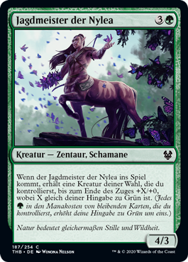 | Rules | When Nylea's Huntmaster enters the battlefield, target creature you control gets +X/+0 until end of turn, where X is your devotion to green. (Each in the mana costs of permanents you control counts toward your devotion to green.) |