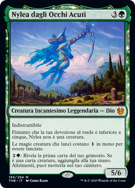 | Rules | Indestructible As long as your devotion to green is less than five, Nylea isn't a creature. Creature spells you cast cost less to cast. : Reveal the top card of your library. If it's a creature card, put it into your hand. Otherwise, you may put it into your graveyard. |