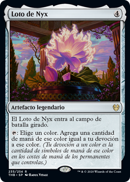 | Rules | Nyx Lotus enters the battlefield tapped. : Choose a color. Add an amount of mana of that color equal to your devotion to that color. (Your devotion to a color is the number of mana symbols of that color in the mana costs of permanents you control.) |
