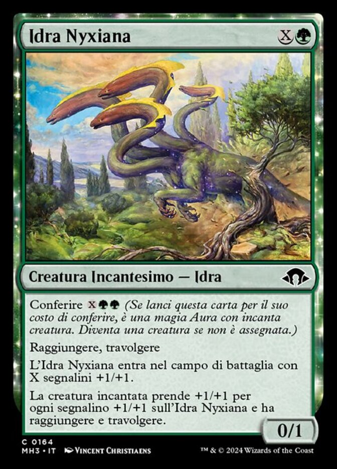 | Rules | Bestow (If you cast this card for its bestow cost, it's an Aura spell with enchant creature. It becomes a creature again if it's not attached.) Reach, trample Nyxborn Hydra enters the battlefield with X +1/+1 counters on it. Enchanted creature gets +1/+1 for each +1/+1 counter on Nyxborn Hydra and has reach and trample. |