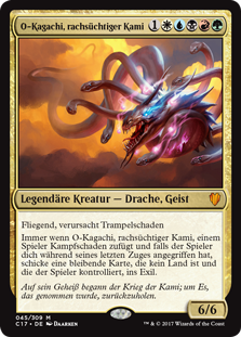 | Rules | Flying, trample Whenever O-Kagachi, Vengeful Kami deals combat damage to a player, if that player attacked you during their last turn, exile target nonland permanent that player controls. |