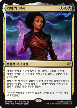 | Rules | When Oath of Kaya enters the battlefield, it deals 3 damage to any target and you gain 3 life. Whenever an opponent attacks a planeswalker you control with one or more creatures, Oath of Kaya deals 2 damage to that player and you gain 2 life. |